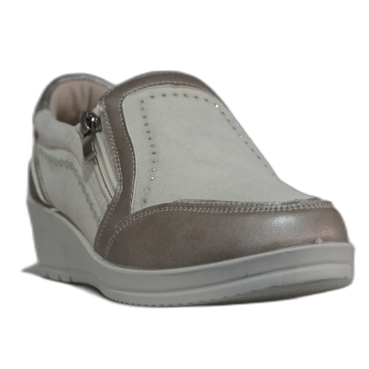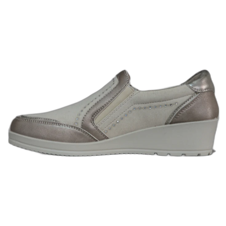 Un mocasín pensado para ofrecer comodidad en cada paso gracias a su diseño deportivo y su cuña ligera. Su combinación de tonos beige y detalles brillantes aporta un toque elegante que combina con cualquier look casual.