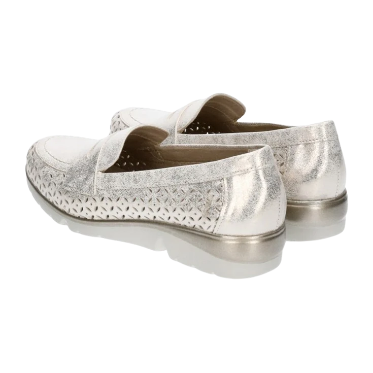 Un mocasín elegante con un toque de luminosidad y detalle artesanal para destacar sin renunciar al confort.