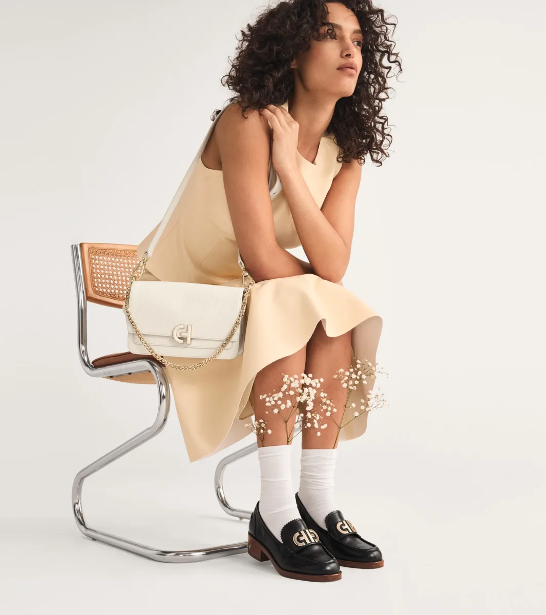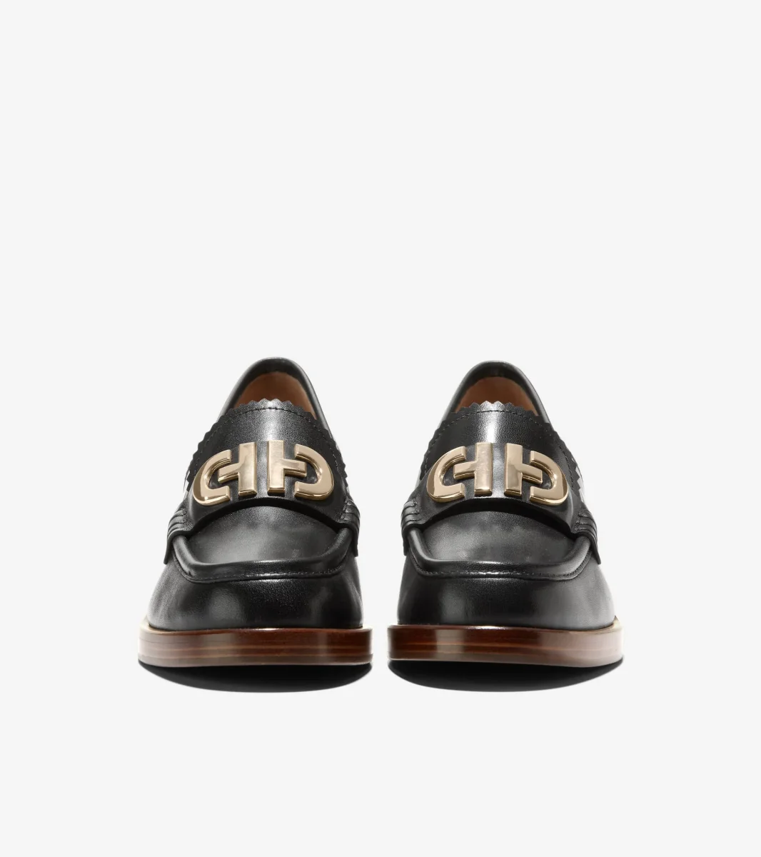 - Parte superior de cuero en negro; herrajes en tono dorado