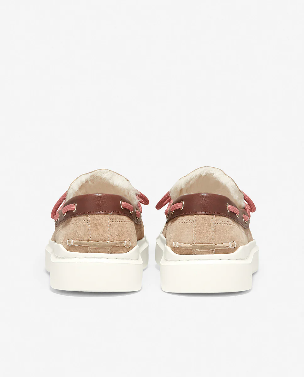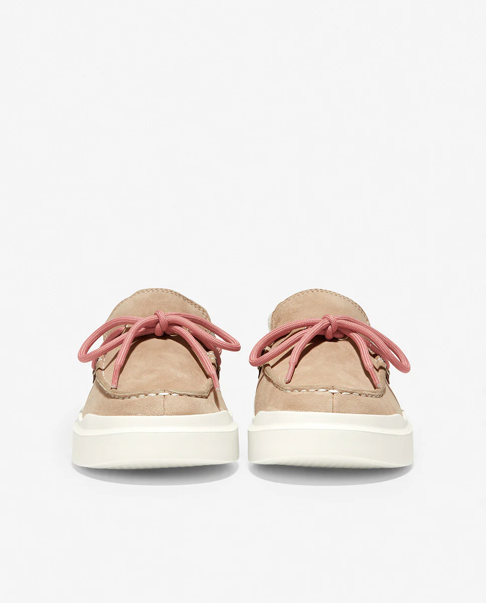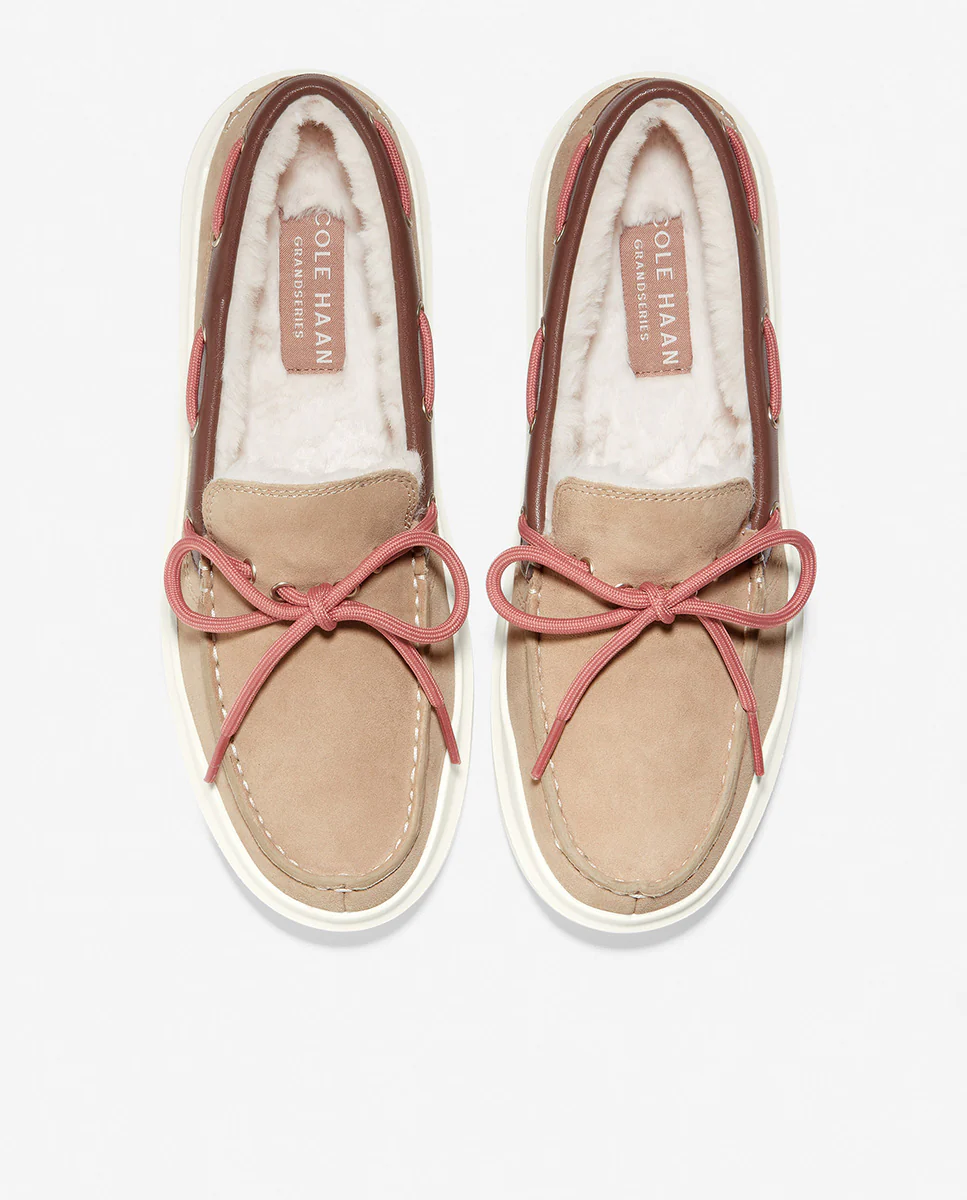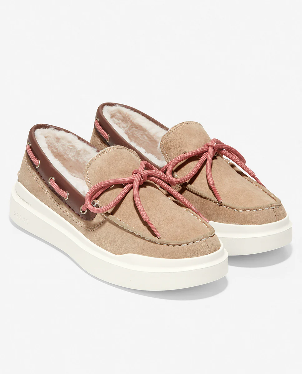 Mocasines náuticos de gamuza y piel con forro interior suave, diseño clásico y lazo decorativo en contraste para un estilo elegante y casual.