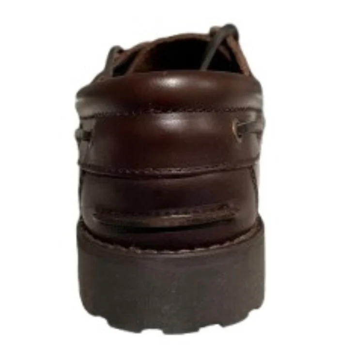 Cuando te calzas este náutico, sientes la textura rica de la piel chocolate que se adapta al pie con naturalidad. El tono profundo transmite sobriedad y sofisticación, mientras la suela de goma proporciona una sensación de solidez al caminar. El ligero eco del cordón al ajustarse refuerza la idea de que se trata de un zapato realizado con atención al detalle.