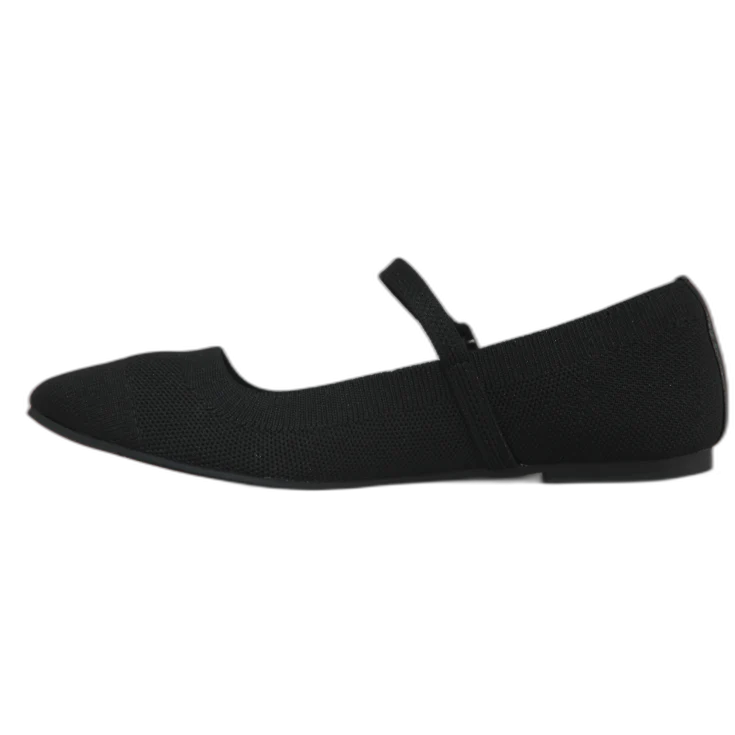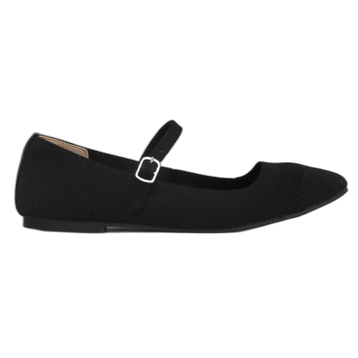 Un modelo estilo bailarina confeccionado en tejido transpirable, con un acabado totalmente negro y una correa con hebilla que asegura un ajuste cómodo y estable. Ideal para quienes buscan un calzado versátil, ligero y fácil de combinar.