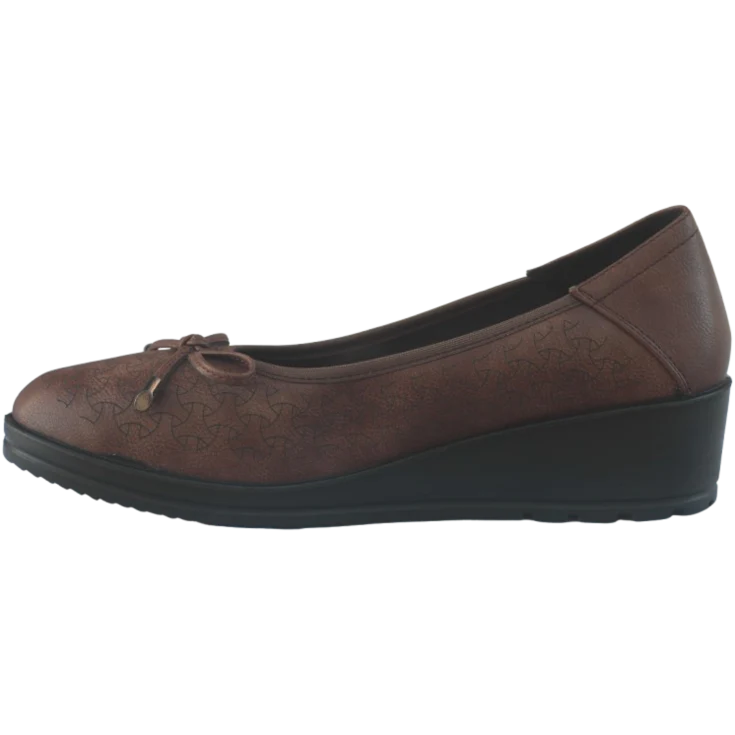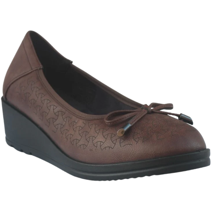 Bailarina modelo Anita, diseñada para ofrecer estilo y comodidad. De color cuero, cuenta con elegantes detalles de dibujos en forma de círculo en color negro que añaden un toque único. La parte superior presenta un lazo decorativo que le da un aire femenino y sofisticado. Su plataforma de 1,5 cm y cuña de 4,5 cm garantizan una pisada cómoda y estable, ideal para el uso diario.