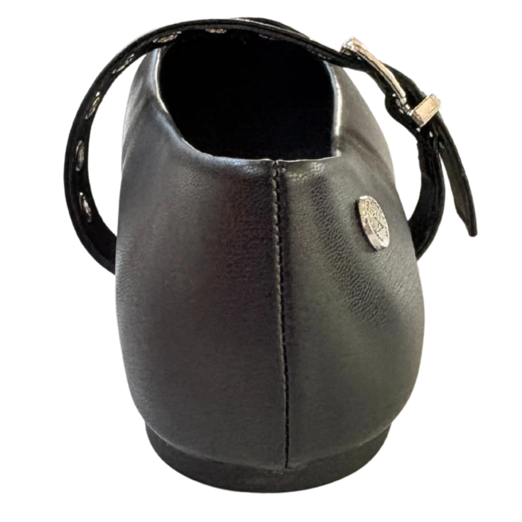 Al tacto, el material se percibe suave y flexible, adaptándose al pie con naturalidad. El negro profundo transmite sobriedad y elegancia, mientras que el brillo sutil del herraje metálico añade un detalle refinado sin excesos.