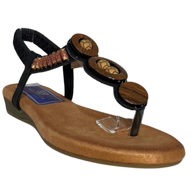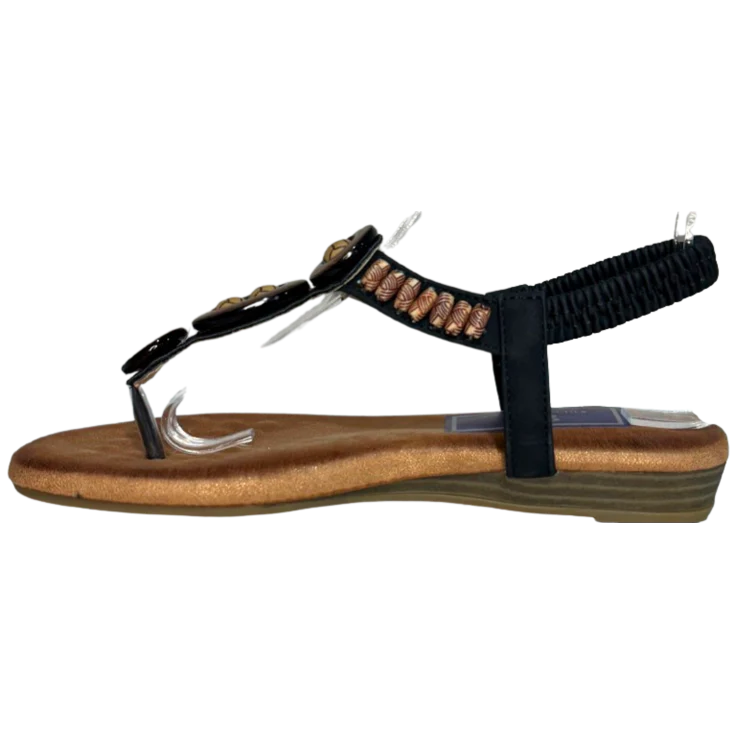 Luce frescura y comodidad con la sandalia Caña en color negro, un modelo de inspiración artesanal que destaca por su diseño trenzado decorativo con cuentas de estilo étnico en el empeine. Su tira tipo T estiliza el pie mientras que el cierre trasero elástico proporciona un calce rápido y cómodo.