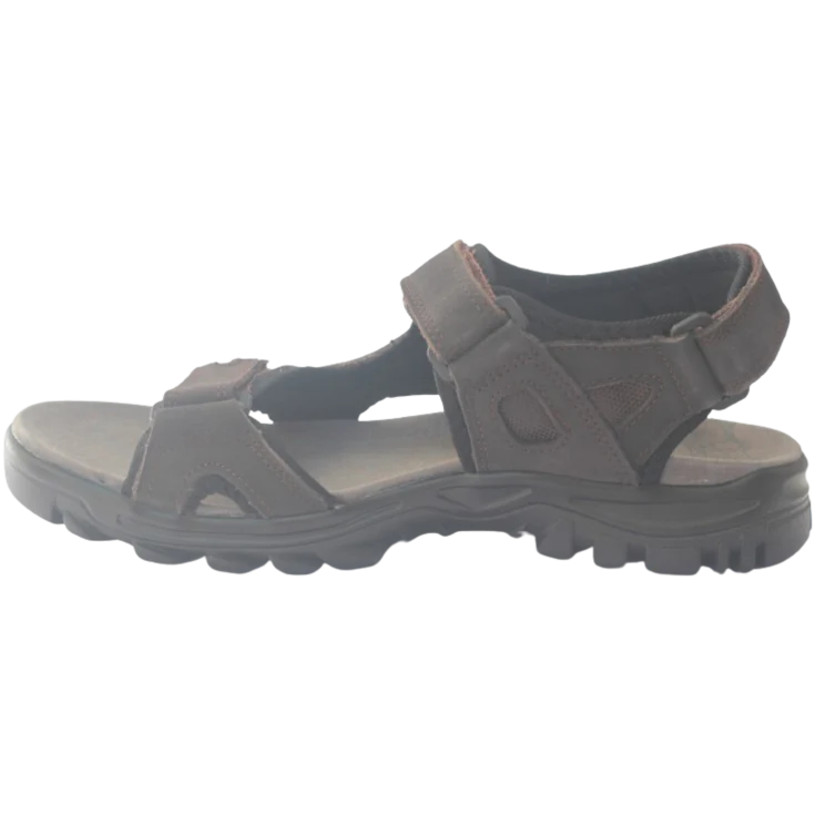 Una sandalia de piel auténtica en tono marrón, diseñada para ofrecer comodidad, estilo versátil y ajuste práctico en cada paso.