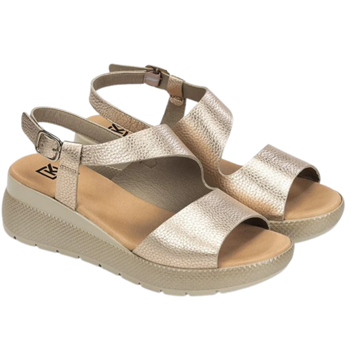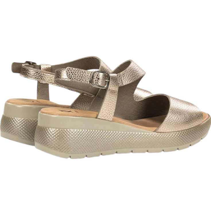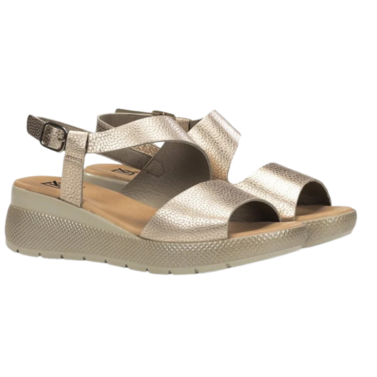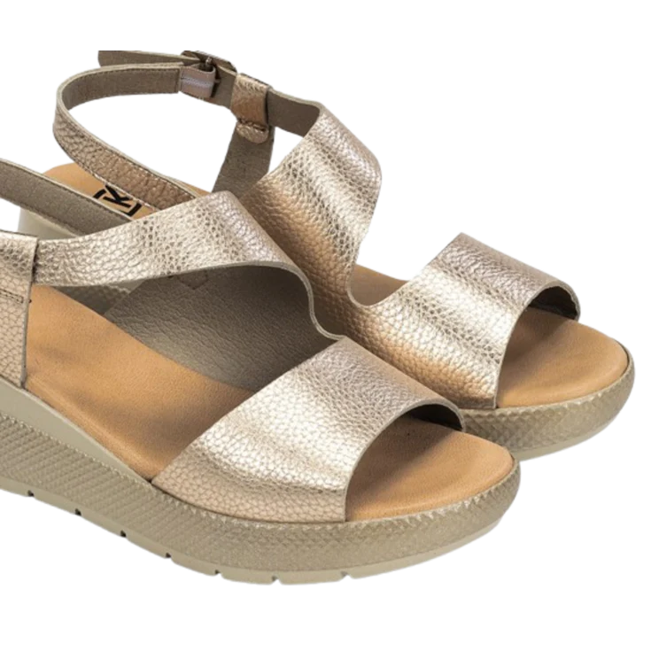 El acabado metálico platino capta la luz con elegancia discreta, aportando un brillo sofisticado sin excesos. Al calzarla, las tiras cruzadas abrazan el pie con suavidad, mientras que la plantilla de gel envuelve la planta para amortiguar pasos. La estructura plataforma + cuña permite caminar con estabilidad, y la suela rugosa da seguridad en distintas superficies.