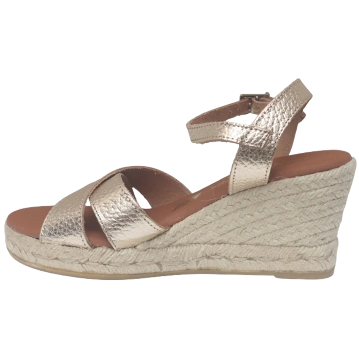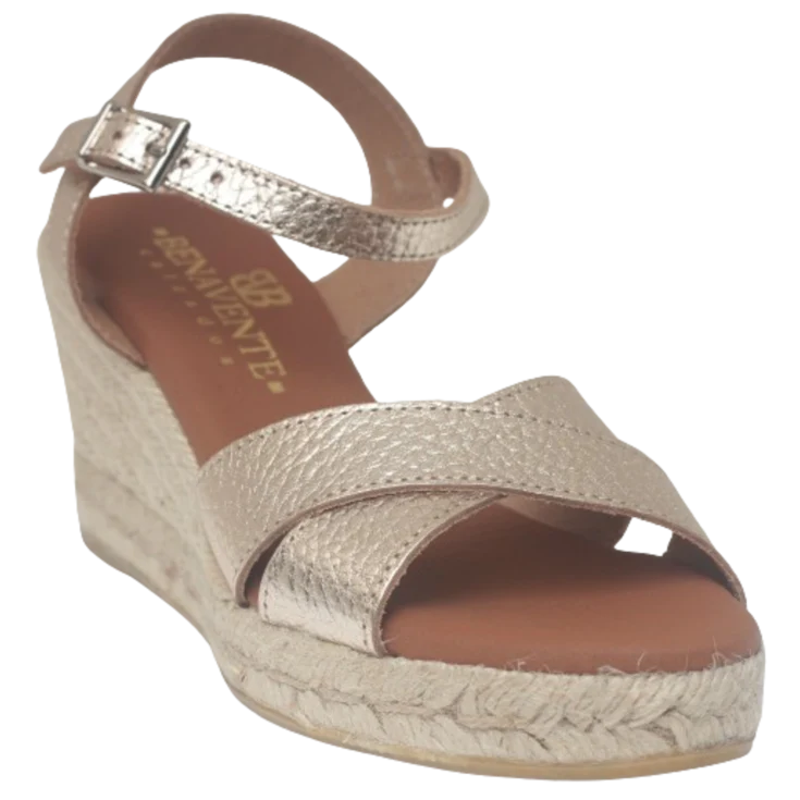 Sandalia cuña Dalila, modelo de cuña en color champang, tiras delanteras cruzadas, plantilla de gel para garantizar la comodidad, cierre de hebilla en forma de pulsera, plataforma de 2 cm y cuña de 7,5 cm, puntera levantada.
