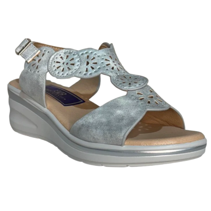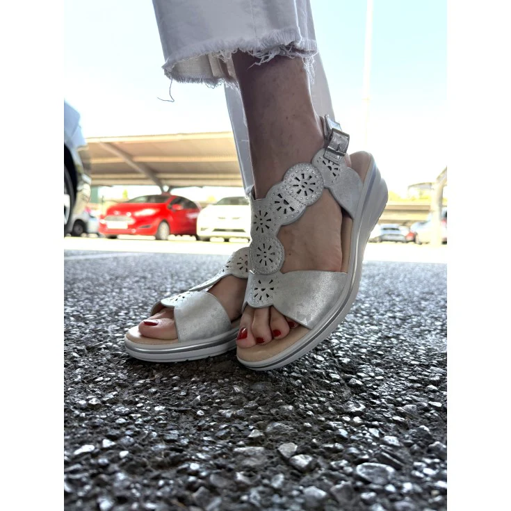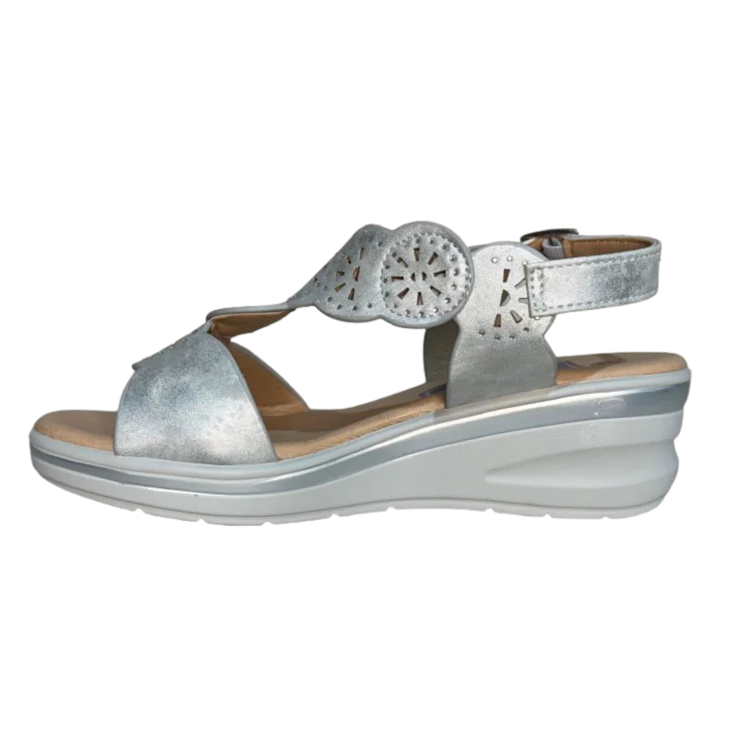 El acabado plateado capta la luz con sutileza, ofreciendo reflejos que dan vida al calzado. Las tiras troqueladas permiten ligeras ventilaciones. Al calzarla, la plantilla memory foam abraza el pie con una sensación de amortiguación envolvente. La cuña suaviza la inclinación y ayuda a distribuir la presión al caminar.