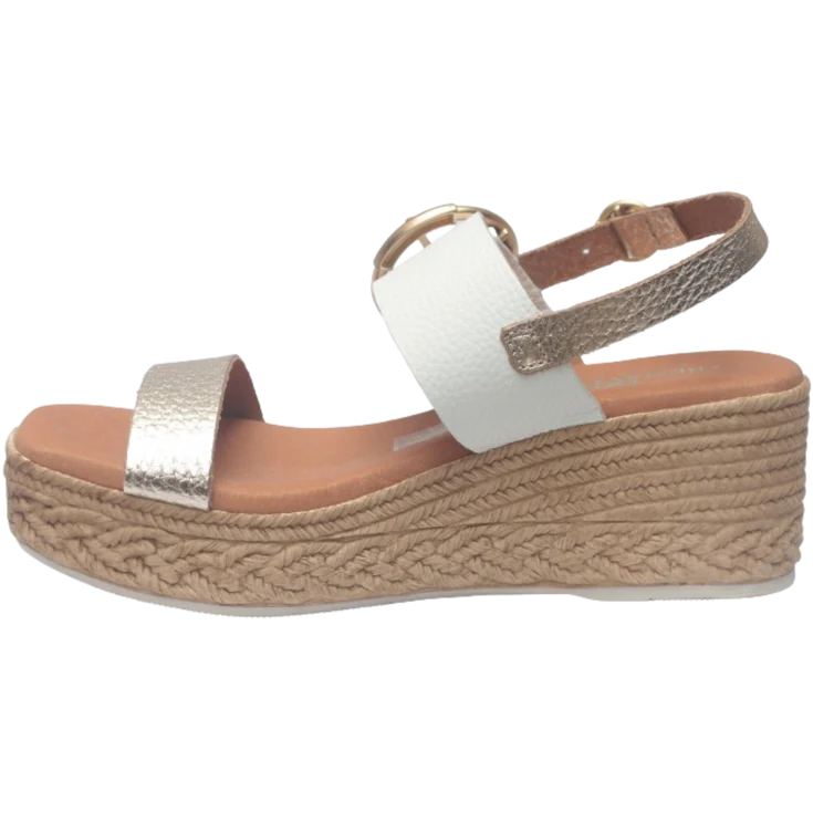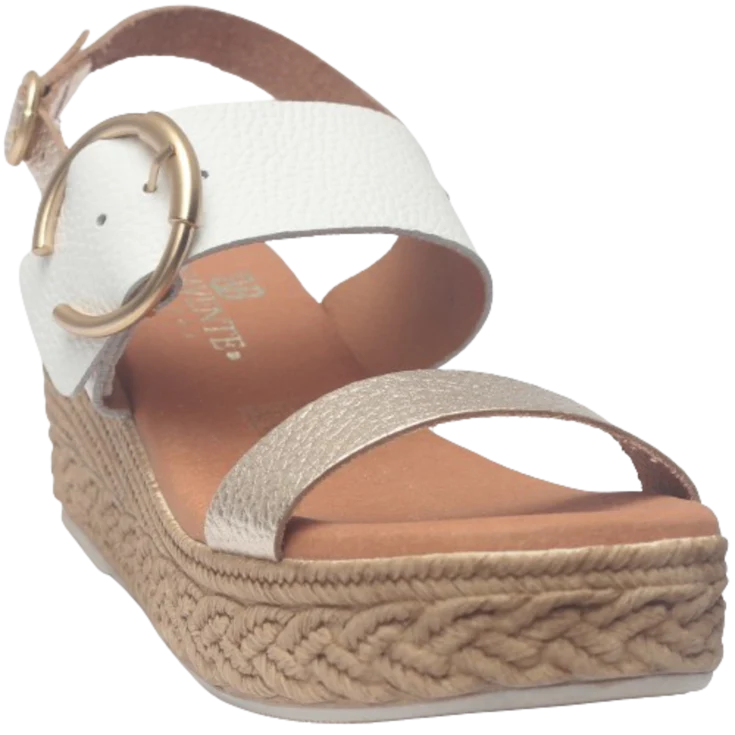 Sandalia Naza, modelo de piel, con dos tiras en la parte de la pala, combinada en blanca con color champang, cierre de hebilla en la segunda tira y en la parte trasera al tobillo, plantilla de gel para garantizar la comodidad al caminar, plataforma de 3,5 cm y cuña de 6,5 cm