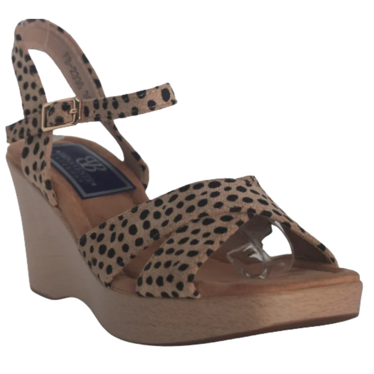 El estampado leopardo aporta carácter y presencia visual, mientras el acabado tipo antelina ofrece una textura suave al tacto. Las tiras cruzadas abrazan el pie con elegancia, y la combinación cuña/plataforma logra una inclinación más amable al caminar.