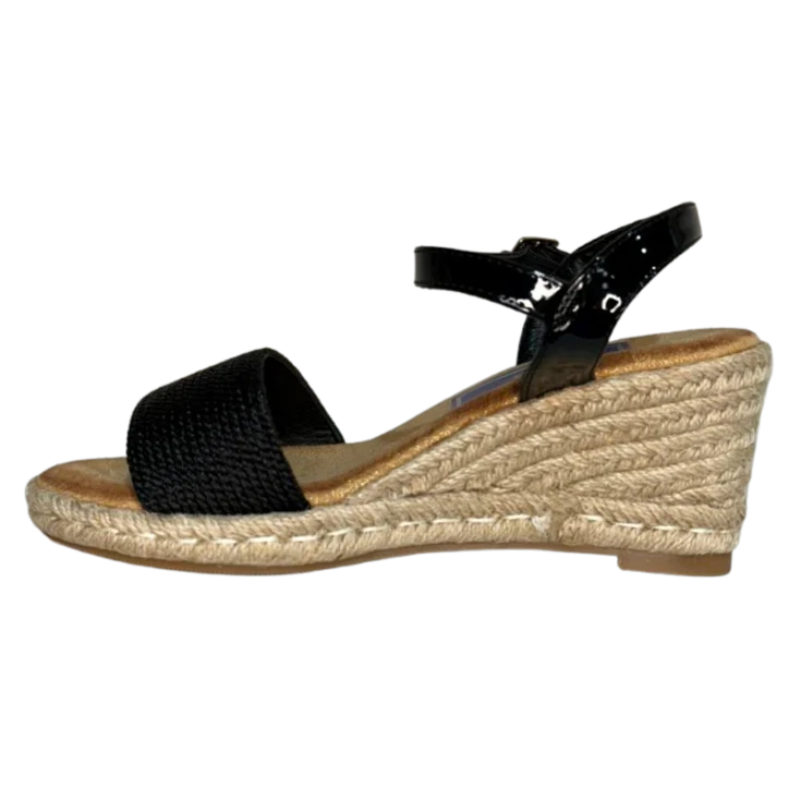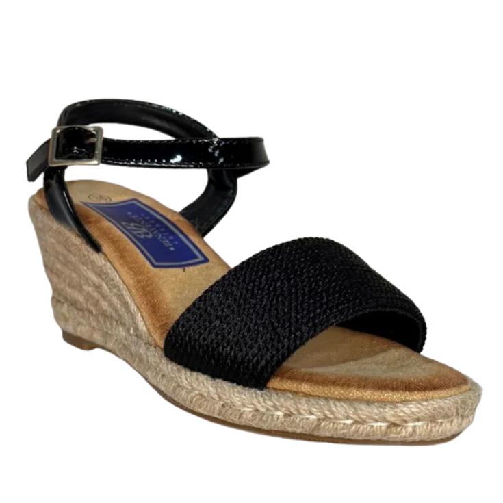 Descubre la elegancia atemporal con la sandalia cuña Tamari en color negro, un modelo diseñado para realzar tu estilo sin renunciar a la comodidad. Su diseño combina una tira delantera con dibujo trenzado y una pulsera con cierre de hebilla en efecto charol, que aporta un toque sofisticado y brillante.