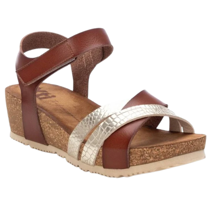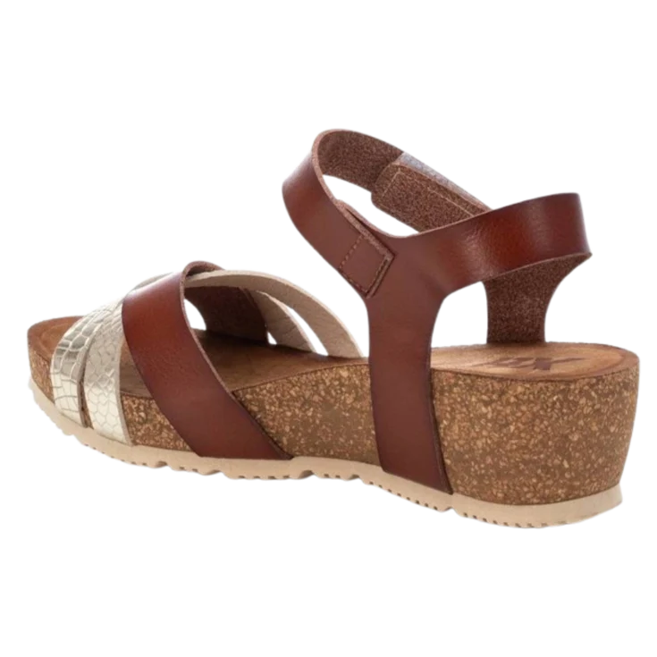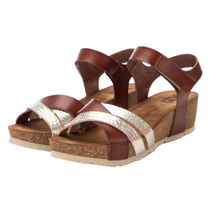 El tono camel transmite calidez y sutileza, integrándose fácilmente con tonos neutros o tierra. Al calzarla, las tiras abrazan el pie con suavidad sin apretar, mientras que la cuña + plataforma equilibran la pisada. La textura interior proporciona suavidad al contacto, haciendo cada paso más agradable.