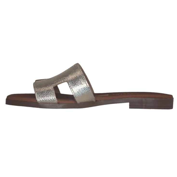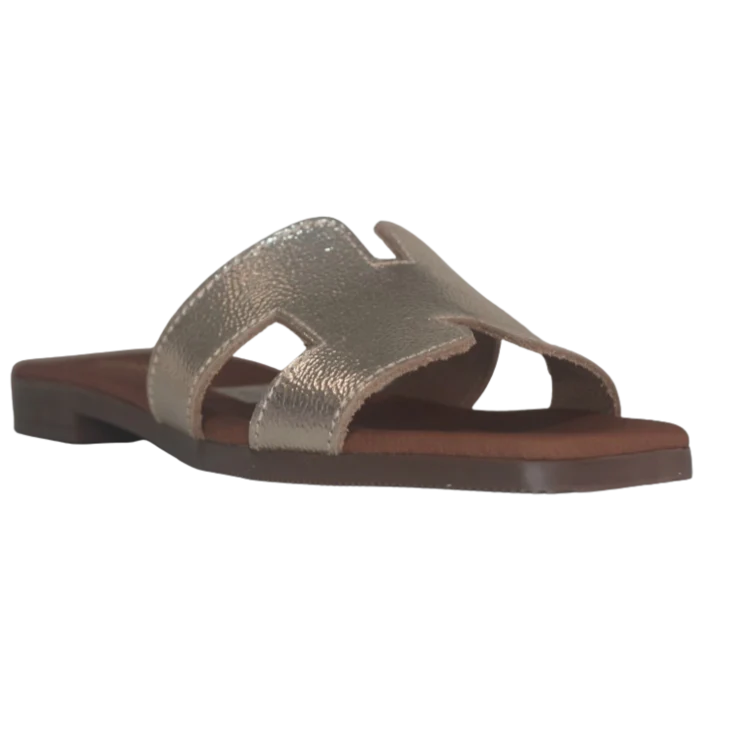 El acabado champang refleja la luz con sutileza, brindando un brillo elegante que no resulta estridente. Al calzarla, la plantilla de gel envuelve la planta con una sensación suave, mientras que la suela de goma aporta estabilidad incluso en superficies resbaladizas. La forma destalonada ofrece ventilación natural y sensación ligera al caminar.