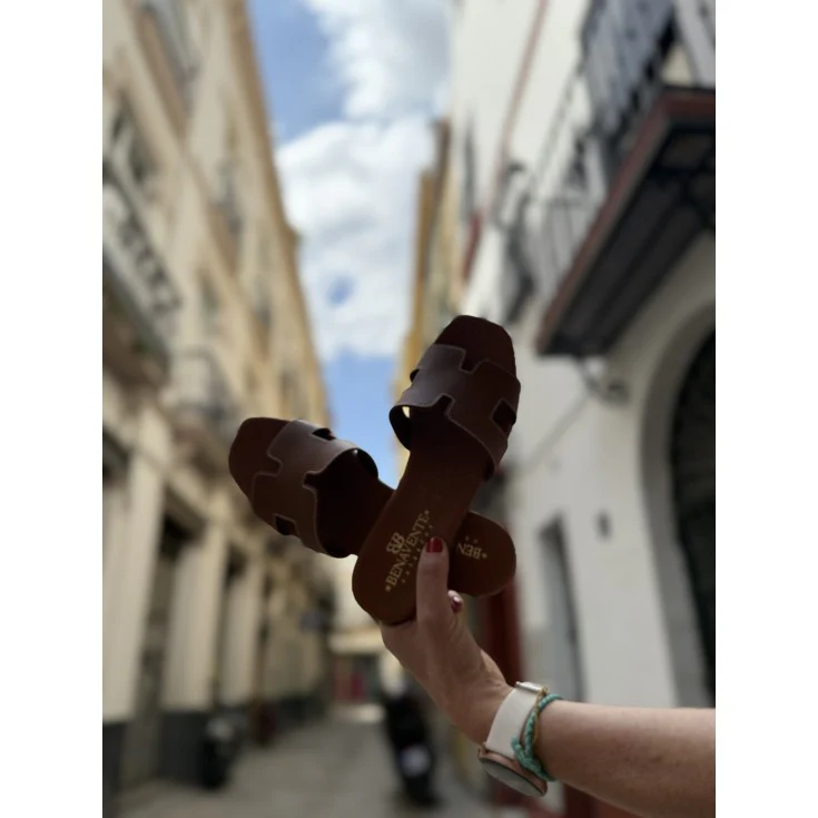 El tono roble aporta una calidez neutra que armoniza con distintos estilos y tonalidades. La plantilla de gel envuelve suavemente la planta, ofreciendo amortiguación al caminar. Al no tener talón cubierto, proporciona una sensación de ligereza y libertad al calzar.