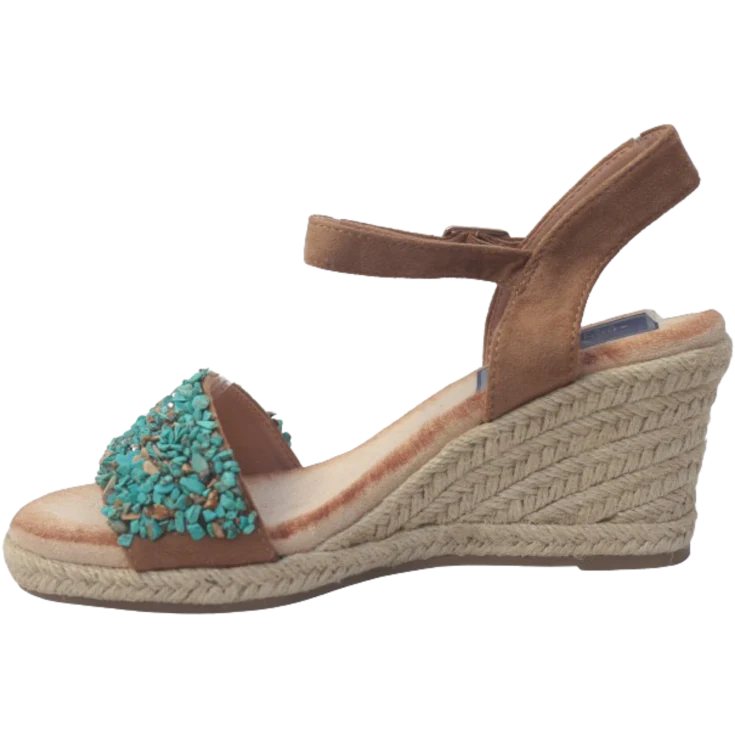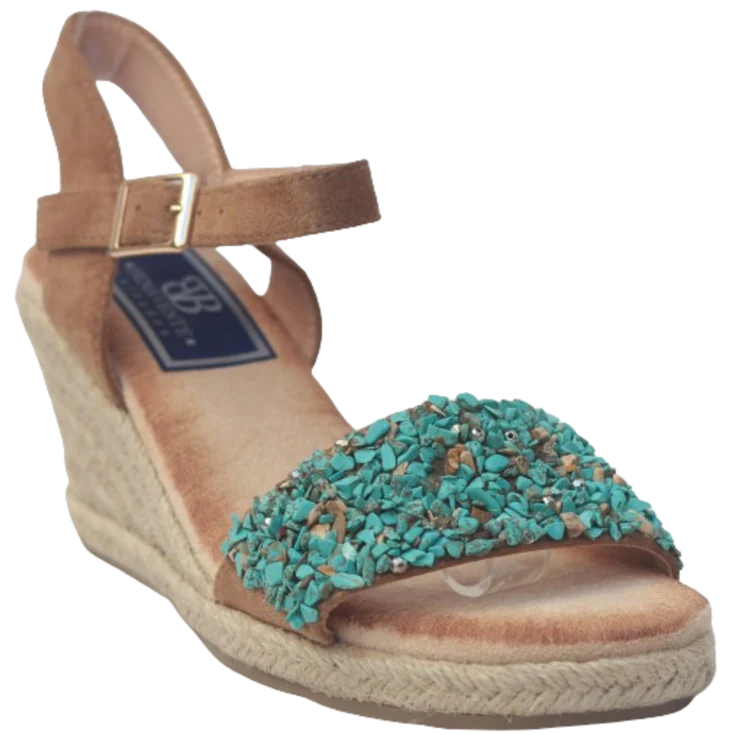 El esparto ofrece un tacto esbozado natural que añade carácter artesanal. Las piedrecitas turquesa en la tira delantera captan la luz y generan un contraste delicado con el tono camel. Al calzarla, la plantilla de memory foam se adapta al contorno del pie suavemente, brindando una sensación amortiguada y envolvente en cada paso.