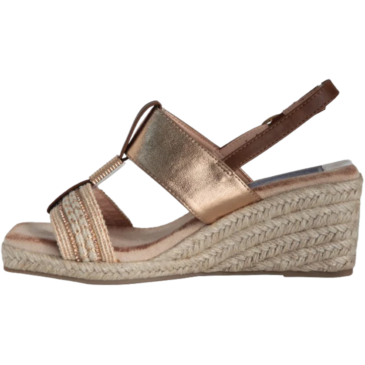 Sandalia modelo Marti de señora. Sandalia en color champang con detalles en oro. Cierre trasero de hebilla. Plantilla de memory foam para mayor comodidad. Cuña de esparto de 6,5 cm y 2,5 de plataforma.