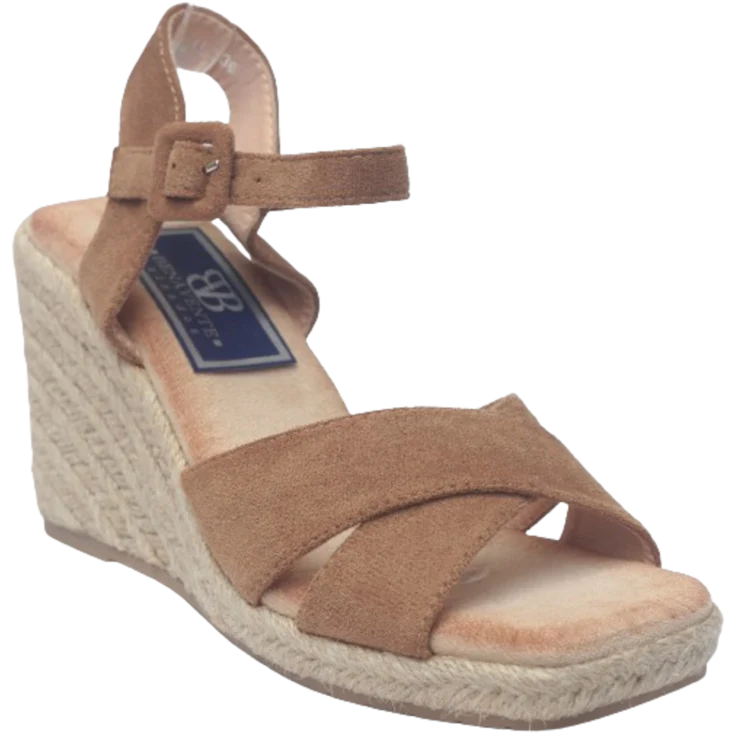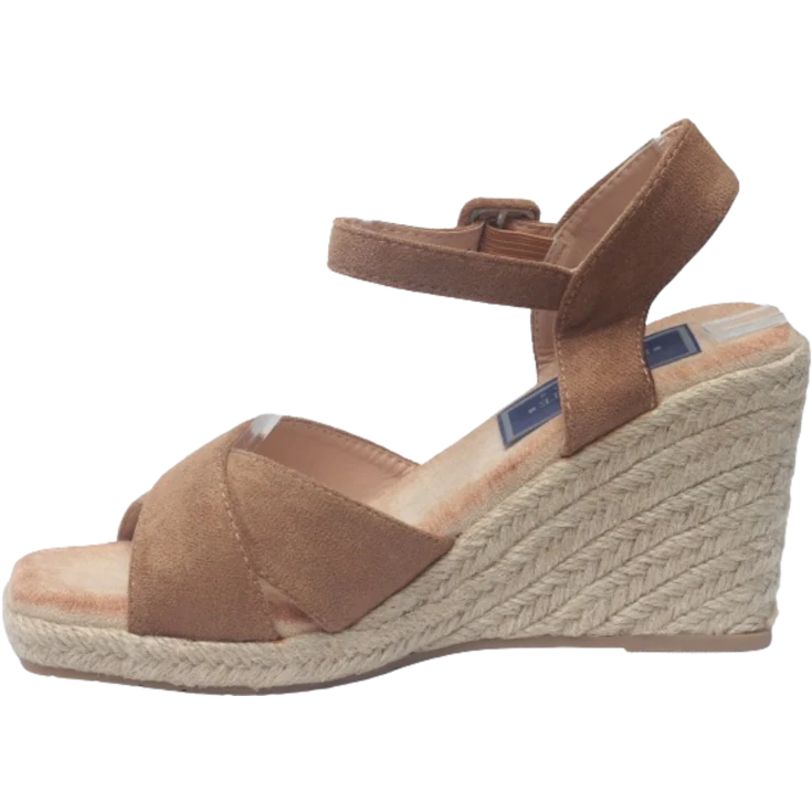 El acabado de esparto aporta textura visual y sensación natural al tacto. El tono camel transmite calidez sin exagerar. Al caminar, la cuña y la plataforma trabajan en conjunto para suavizar la inclinación, y la plantilla acolchada abraza el pie con confort.