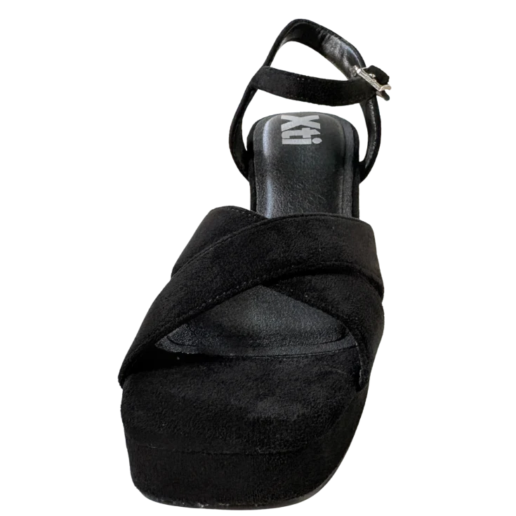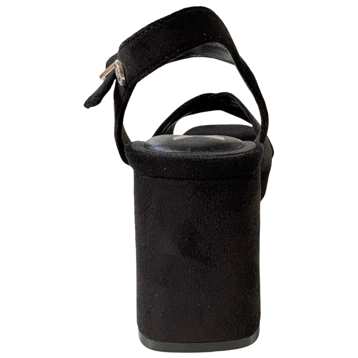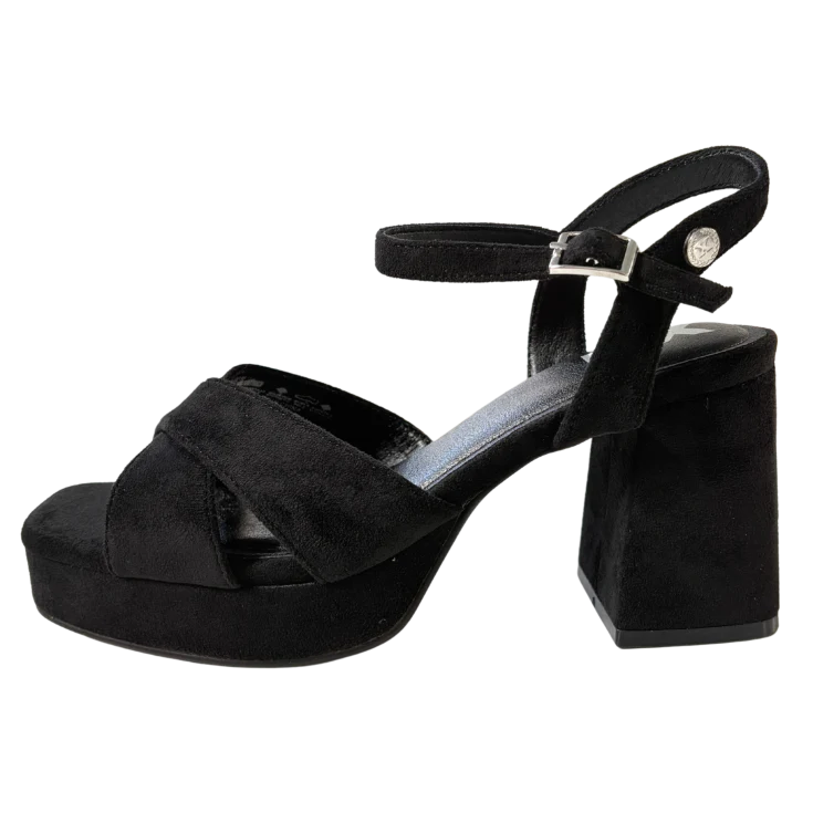 La antelina ofrece una textura suave y elegante que se percibe delicadamente al tacto. El negro profundo aporta una presencia sofisticada y atemporal, mientras que el tacón de 8 cm, junto a la plataforma, proporciona una pisada firme, estable y cómoda durante toda la velada.