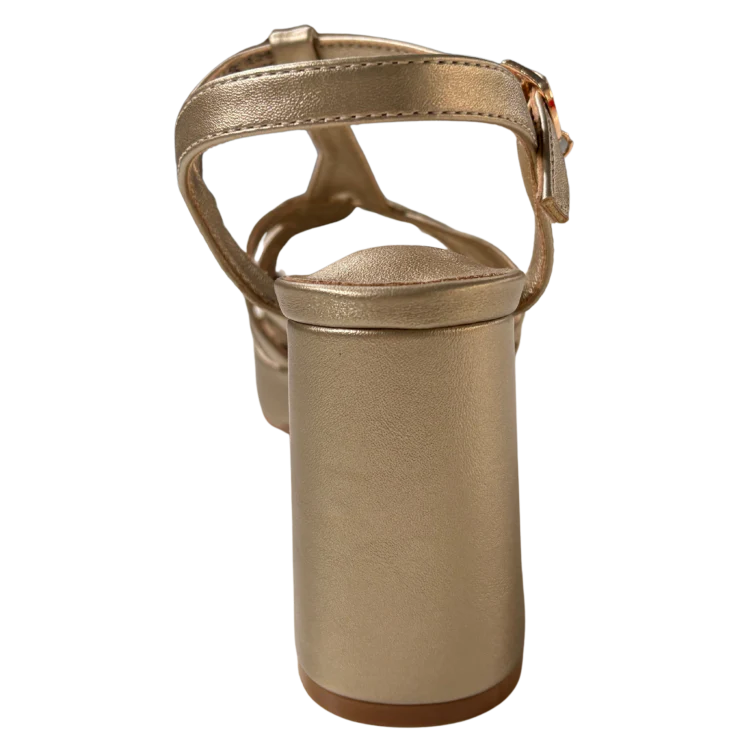 Esta sandalia de fiesta combina un acabado metalizado dorado con una silueta elegante y moderna. Sus tiras finamente cruzadas estilizan el pie, mientras que el tacón ancho y la plataforma frontal aportan equilibrio y comodidad, convirtiéndola en la aliada perfecta para eventos, celebraciones y noches especiales.