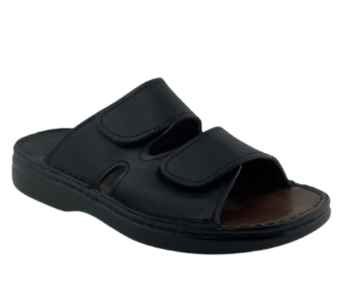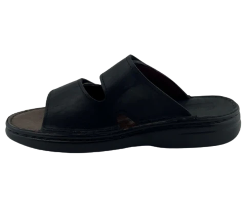 Sandalia para hombre, en color negro. Sandalia con cierre de velcro lateral y descubierta por detrás para ajustarse a cualquier pie. Piso goma negro de 3 cm.