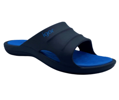 Sandalia infantil de Igor en color marino de goma. Tira delantera con detalle de la marca. Plantilla acolchada y suela de goma.