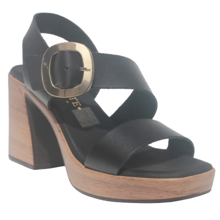 Sandalia Johana, modelo de piel en color negro con diferentes tiras, cierre de hebilla ancho, la plantilla de gel genera una suela acolchada, correas ajustable y una altura de tacón moderada que contribuye la comodidad genera del zapato. Plataforma de 2,5 cm y tacón ancho de 8 cm