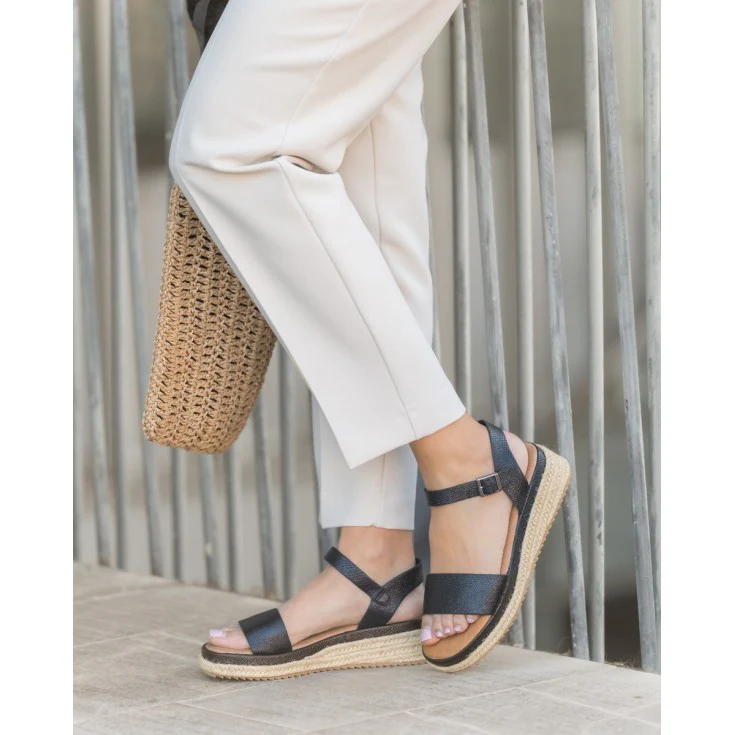El negro proyecta sobriedad, haciéndola sencilla de combinar. Las tiras cruzadas envuelven el pie con suavidad, y al caminar la estructura plataforma suaviza la inclinación del pie. La plantilla acolchada aporta una sensación amortiguada que hace más placentero el uso prolongado.