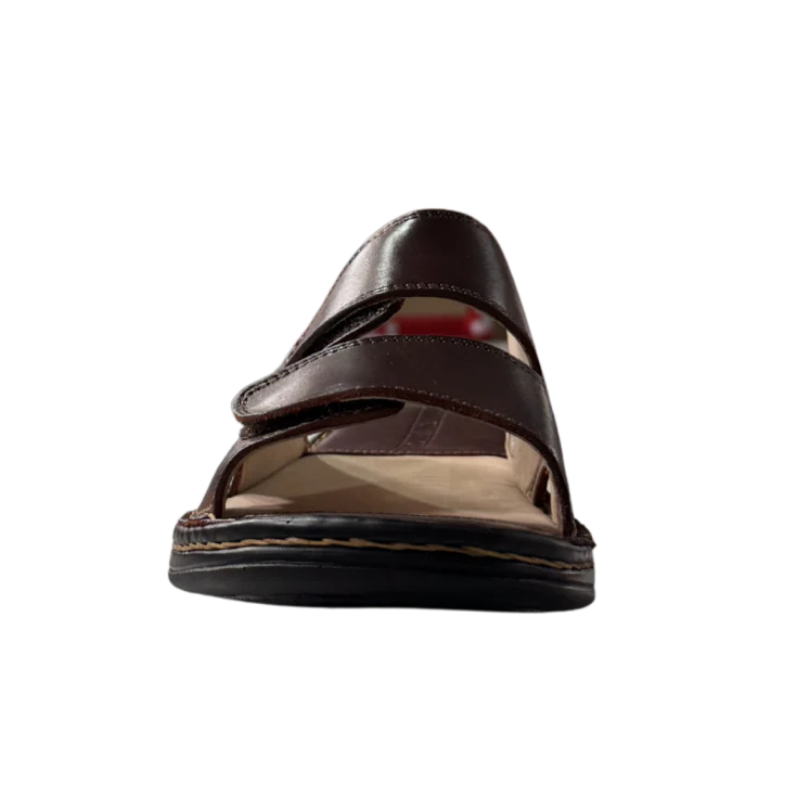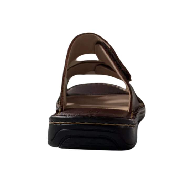 Esta sandalia destaca por su diseño práctico con tiras anchas de piel y cierres de velcro ajustables, que permiten adaptar el calzado perfectamente al pie. Su plantilla cómoda y su suela resistente ofrecen una pisada estable y confortable, perfecta para caminar con total tranquilidad.
