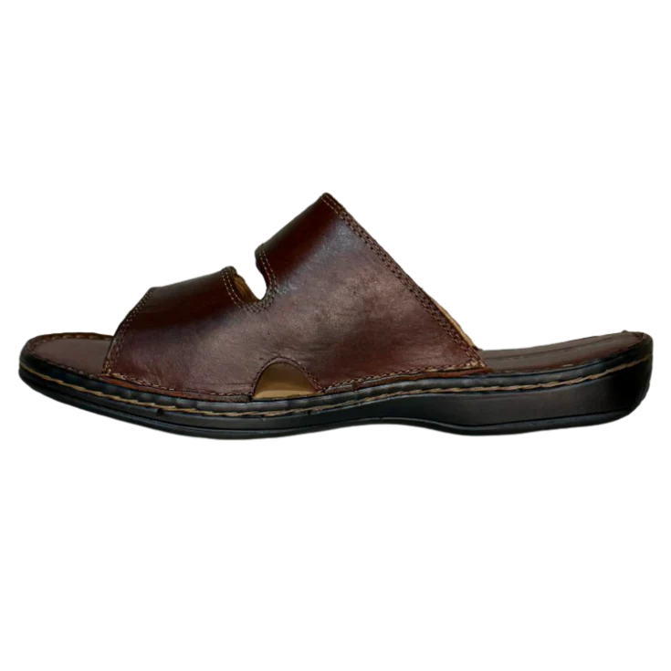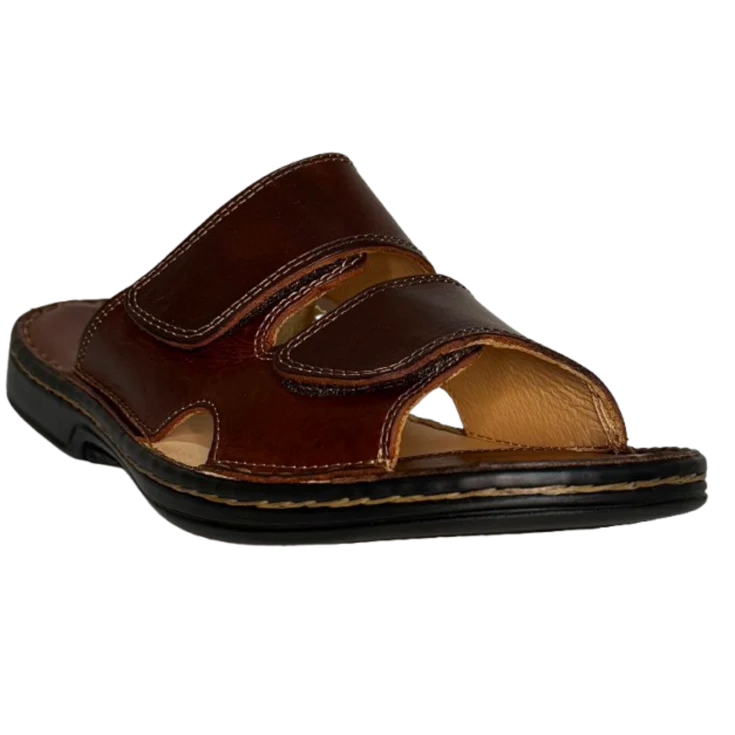 Una sandalia de piel auténtica, en tono coñac, diseñada para el hombre que busca un calzado sofisticado, fresco y cómodo para la temporada de buen tiempo.
