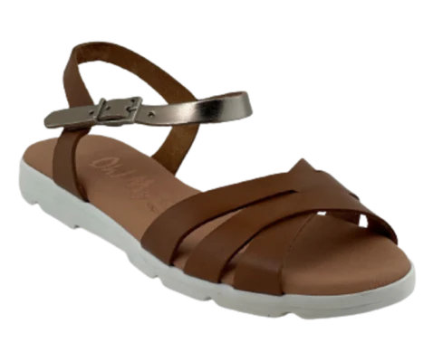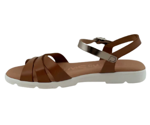 El color roble transmite calidez y versatilidad. Las tiras de piel se adaptan al pie con suavidad y firmeza. Al caminar, la plantilla de gel amortigua cada paso mientras que la suela de goma aporta seguridad incluso en superficies lisas. El cierre de hebilla permite ajustar sin molestias.
