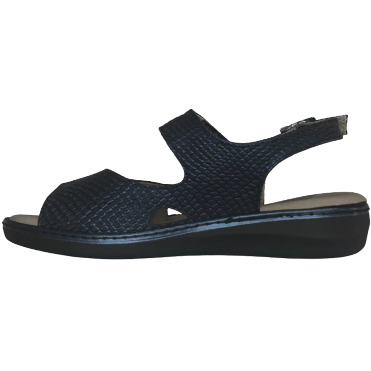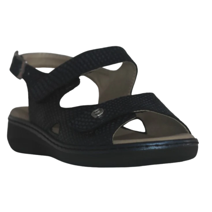 El azul marino aporta una presencia elegante sin ser estridente. Al ajustar los velcros, sentirás cómo la sandalia se adapta al contorno del pie de forma cómoda y segura. La cuña distribuida suavemente da una inclinación leve que no exige esfuerzo, y la plantilla acolchada ofrece una sensación envolvente que reduce la fatiga con cada paso.