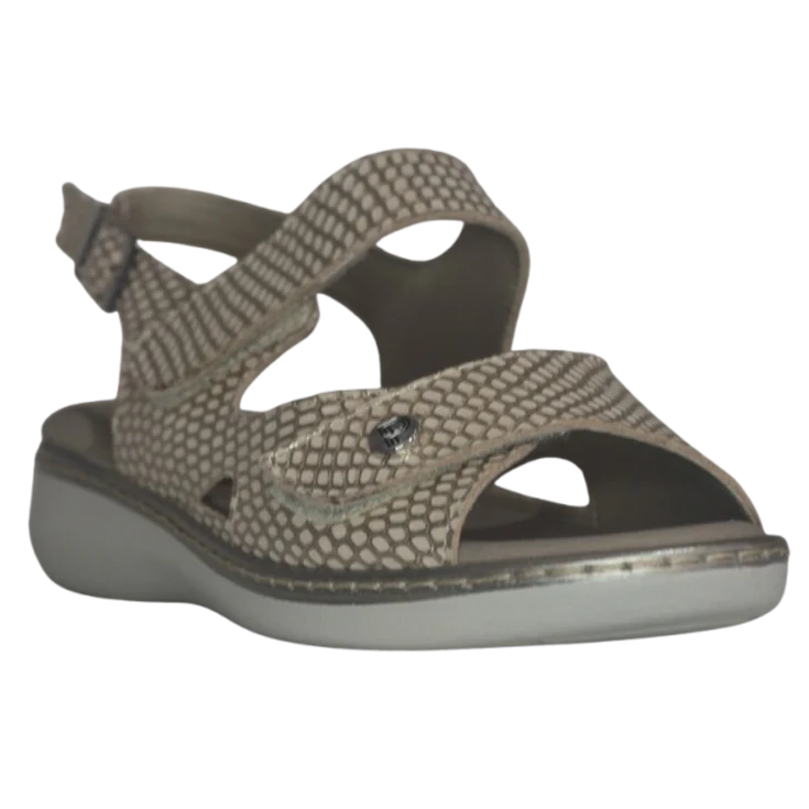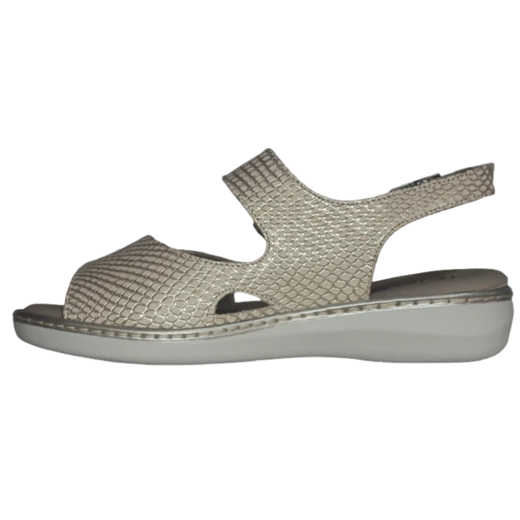 El acabado dorado capta la luz con delicadeza, realzando tu silueta con un brillo sutil. Al ajustar los velcros, sentirás cómo la sandalia se adapta al contorno del pie de forma segura pero flexible. La plantilla interior amortigua las pisadas, mientras la suela de goma asegura estabilidad y firmeza en cada paso.