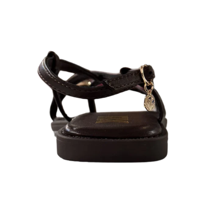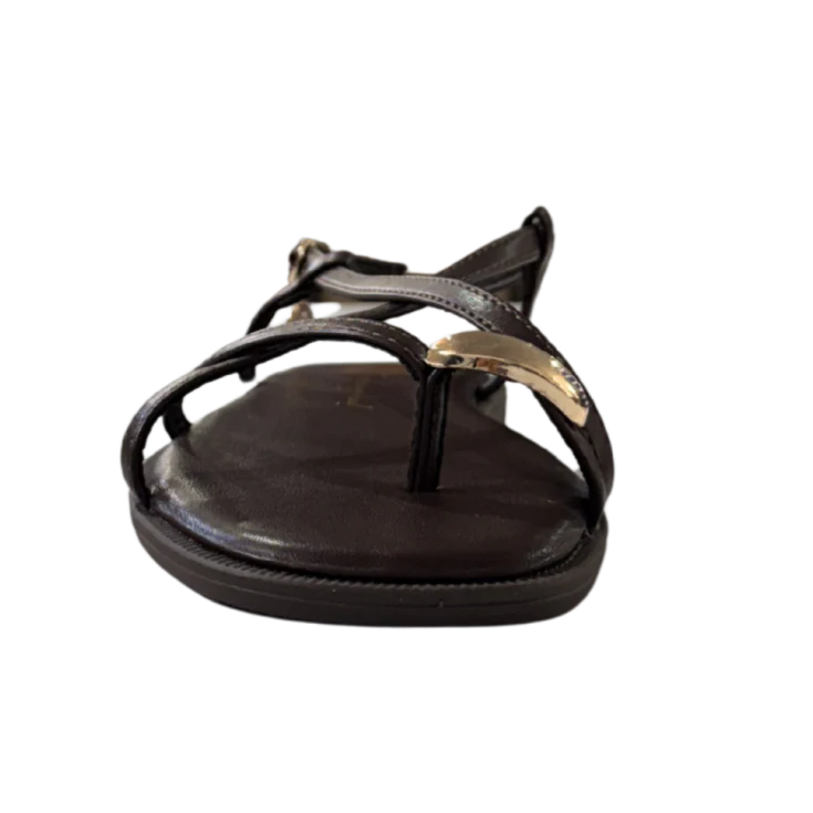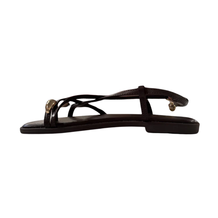 Esta sandalia plana destaca por su diseño minimalista con tiras cruzadas que estilizan el pie y proporcionan una sujeción cómoda. El detalle metálico decorativo añade un toque moderno y elegante, mientras que su tono marrón permite combinarla fácilmente con todo tipo de outfits veraniegos.