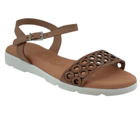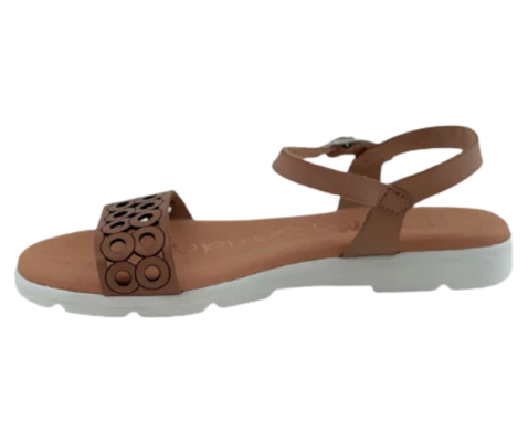 Sandalia plana hecha de piel para mujer y niña, en color nude. Sandalia con plantilla de gel muy cómoda. Diseño de tira delantera troquelada en círculos. Cierre de hebilla sobre tira de cuero. Altura piso: 2,5cm.