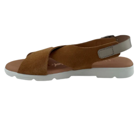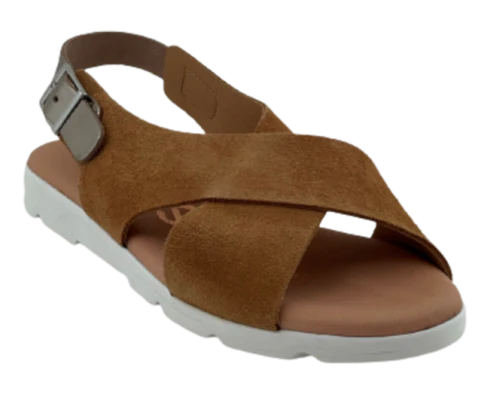 Sandalia plana hecha de piel para niña y para mujer, en serraje camel. Sandalia con plantilla de gel muy cómoda. Diseño de tiras anchas texturizadas cruzadas. Cierre de hebilla al tobillo sobre tira metalizada.