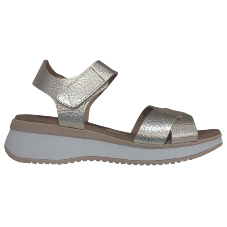 El acabado champán capta la luz de forma elegante, proyectando destellos suaves que acompañan el movimiento. Al calzarla, sentirás cómo la plantilla de gel envuelve el pie con suavidad, amortiguando puntos de presión. El cierre de velcro se ajusta sin esfuerzo y mantiene el pie firme sin incomodar.