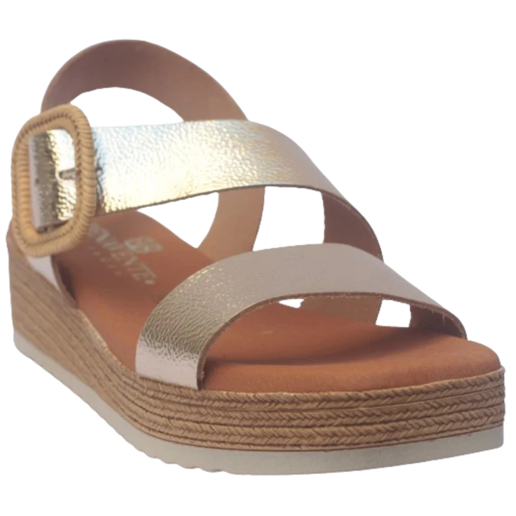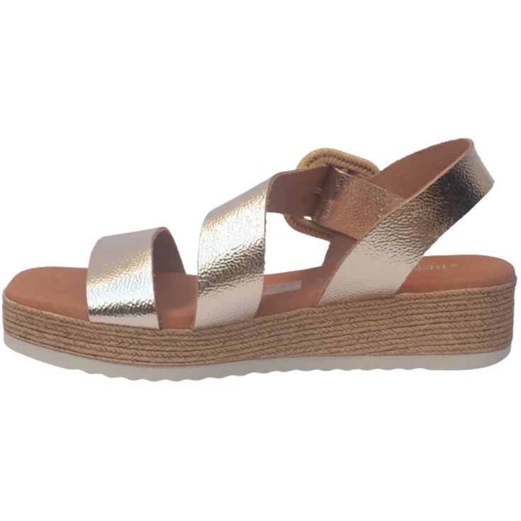 El tono champang capta la luz con sutileza, proyectando reflejos suaves que acompañan el movimiento sin exageración. La plataforma + cuña ofrecen una elevación equilibrada, haciendo que caminar con ellos sea más estable. La plantilla de gel abraza la planta con delicadeza, amortiguando cada contacto con el suelo. La hebilla con detalle tipo esparto aporta un sello artesanal que distingue el diseño.