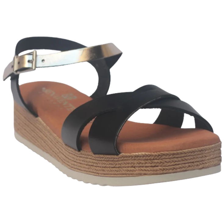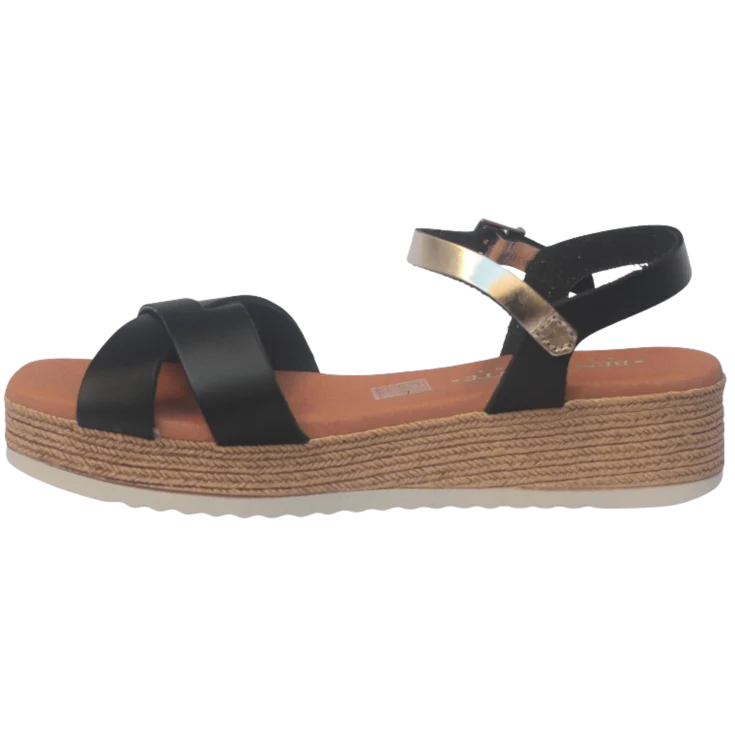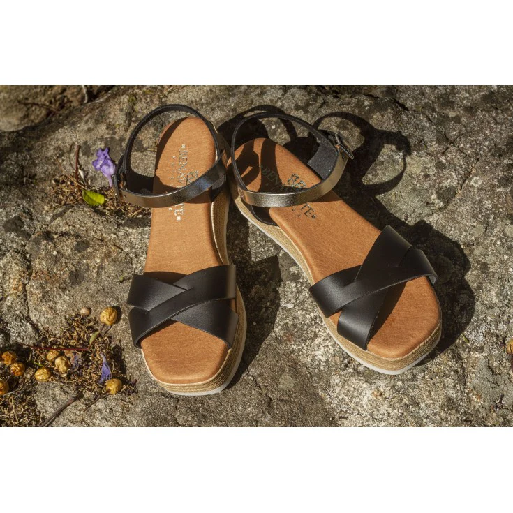 Sandalia Remei, modelo en color negro con diferentes tiras cruzadas en la parte de la pala, cierre de hebilla en color oro, plantilla de gel para garantizar la comodidad, puntera redonda y levantada, plataforma de 2,5 cm y cuña de 4 cm