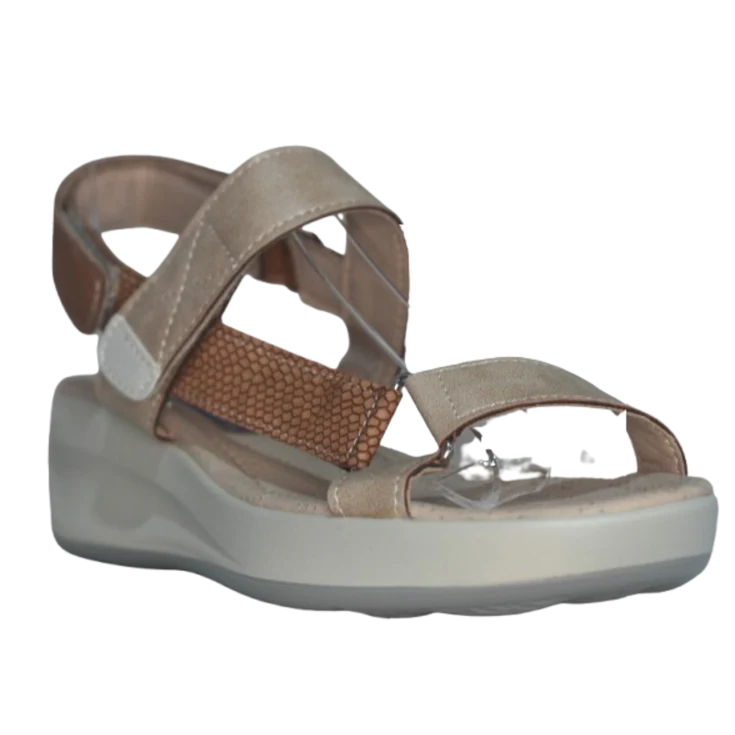 La sandalia Sereis en tono camel-taupe ofrece un diseño cómodo, ligero y con detalles que aportan estilo a cada paso. Sus tiras con textura combinada y cierre de velcro permiten un ajuste fácil y seguro, adaptándose perfectamente al pie.