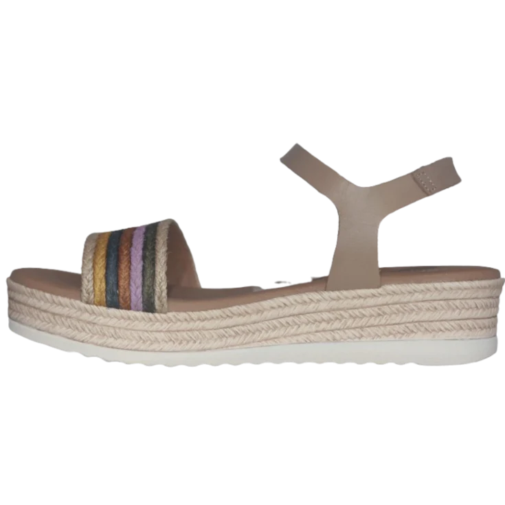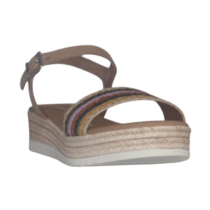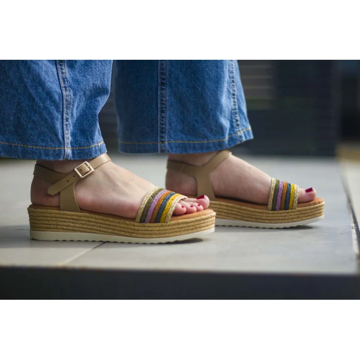 El efecto combinado en tonos taupe aporta un matiz cálido que combina con múltiples paletas cromáticas. La tira tipo esparto multicolor aporta textura visual y tacto suave. Al caminar, la plataforma + cuña brinda estabilidad y soporte, mientras la plantilla de gel amortigua cada paso con suavidad.