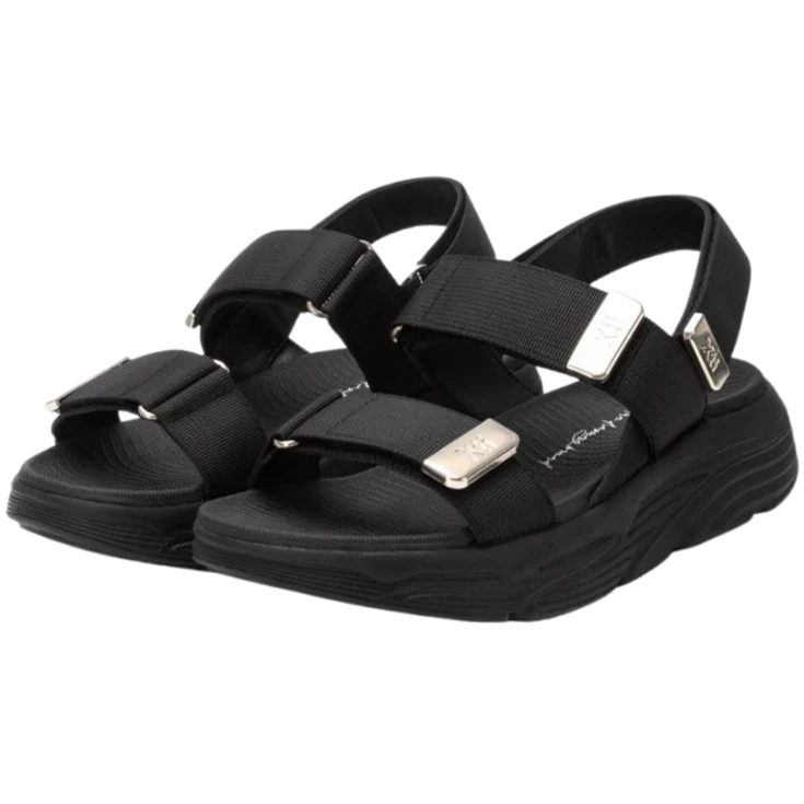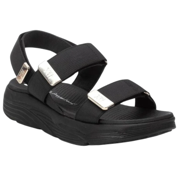 Sandalia Plataforma Textil Negro, modelo de la marca XTI en color negro, ideal para quienes buscan un calzado cómodo y con estilo. Su diseño con tiras anchas ajustables y detalles metálicos aporta un toque moderno y sofisticado. La plataforma de 3 cm y el piso de goma garantizan una pisada estable y confortable durante todo el día.