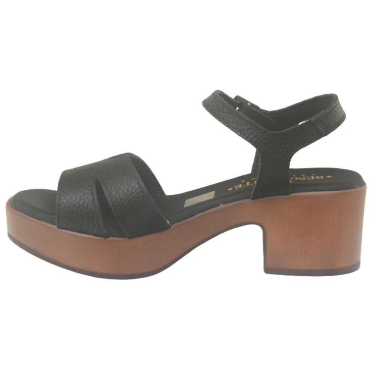 Sandalia Adara, modelo de piel en color negro, cierre de hebilla en forma de pulsera, la plantilla de gel proporciona un nivel excepcional de confort, asegurando una pisada suave y amortiguada en cada paso, plataforma de 2,5 cm y tacón ancho de 5,5 cm. puntera levantada para garantizar la comodidad al caminar