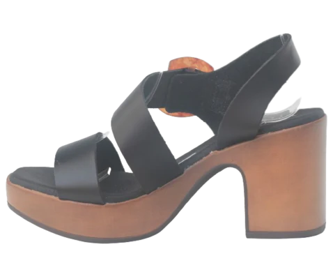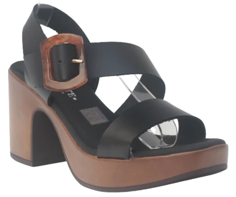 Sandalia tacón Bimba, modelo en color negro, tira cruzada a lo largo de la pala, cierre de hebilla, piso en color cuero, plantaforma de 3,5 cm, con puntera levantada para garantizar la comodidad, y tacón de 8,5 cm