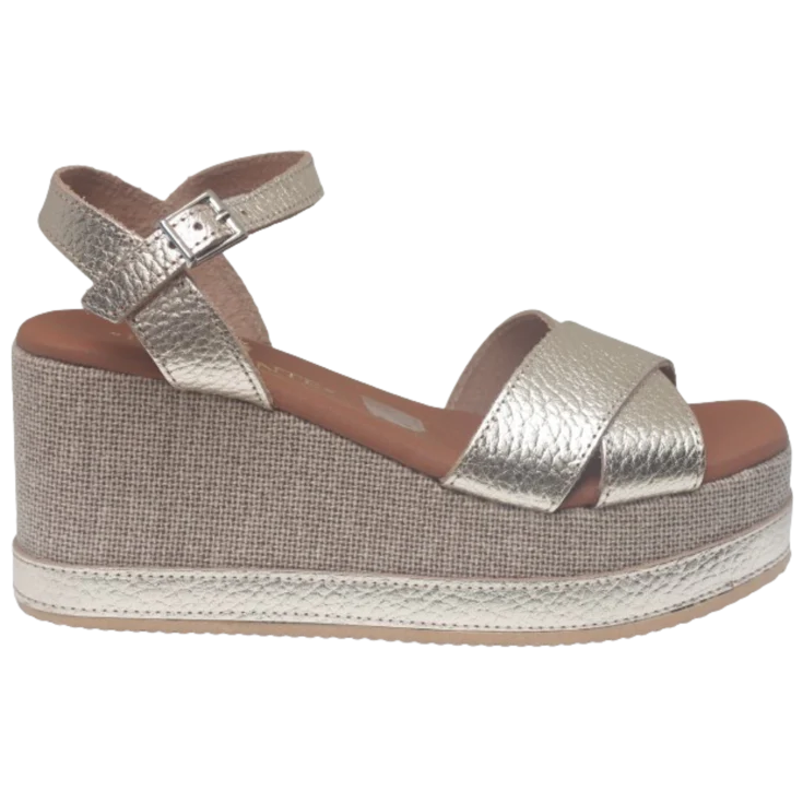 Al deslizar tu pie en la sandalia, sentirás la suavidad de la piel y el susurro de las tiras cruzadas acariciar el empeine. El acabado champang capta la luz con un tenue resplandor, mientras que la plataforma y el tacón trabajan en conjunto para elevar tu silueta con comodidad. Cada paso se convierte en una experiencia: la plantilla de gel se adapta suavemente, el cierre de hebilla abraza el tobillo y la suela de goma te aporta la seguridad que necesitas.