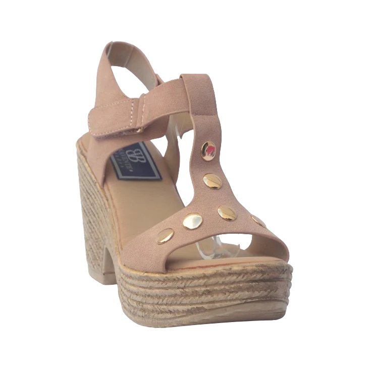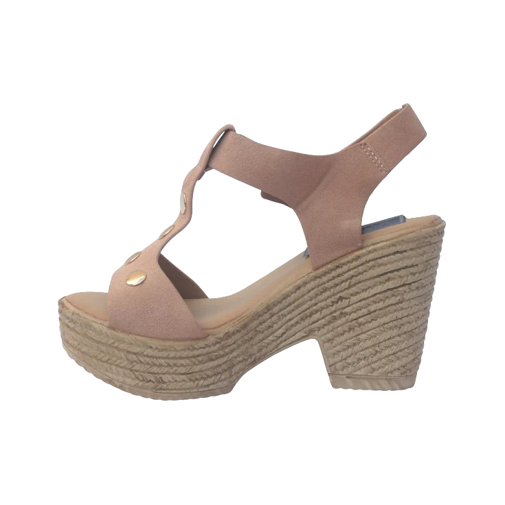Sandalia Gertrudis, modelo con una tira en la parte de la pala en color nude con diferentes adornos en color plata, cierre de velcro en forma de pulsera, piso simulando la esparto, plataforma de 3,5 cm y tacón de 9,5 cm, puntera redonda y levantada para garantizar la comodidad