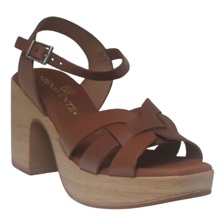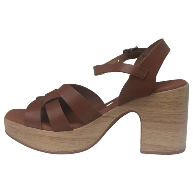 Sandalia tacon Indara, modelo en color roble, parte delantera con tiras cruzadas para garantizar el agarre, la plantilla de gel proporciona un soporte adicional y una sensación de amortiguación que permite estar de pie o caminar durante largos periodos sin sacrificar la comodidad, cierre de hebilla en forma de pulsera, puntera levantada para garantizar la comodidad, plataforma de 3 cm y tacón ancho 8,5 cm
