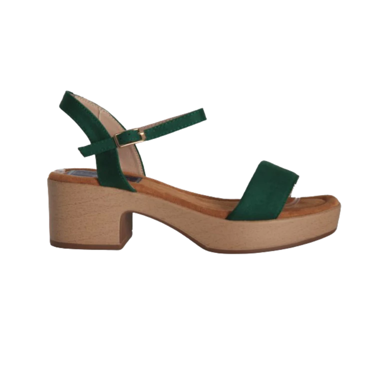 Sandalia modelo Vicky. Sandalia de señora en color verde, sandalia con plantilla memory foam. Cierre de hebilla lateral. Tacón simulando la madera de 5,5 cm y 2,5 plataforma.