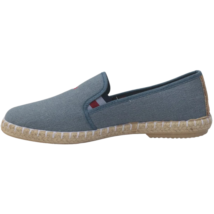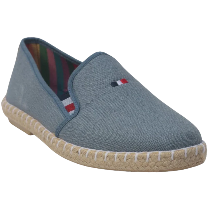 Al calzarte esta zapatilla sentirás la textura envolvente del tejido tipo esparto rozando tu pie con suavidad, mientras el cierre elástico se ajusta sin esfuerzo. La suela de goma amortigua cada paso, y el color tejano aporta un toque relajado y moderno que capta miradas sin alardes.