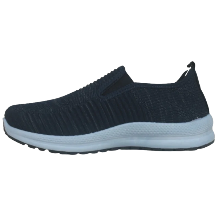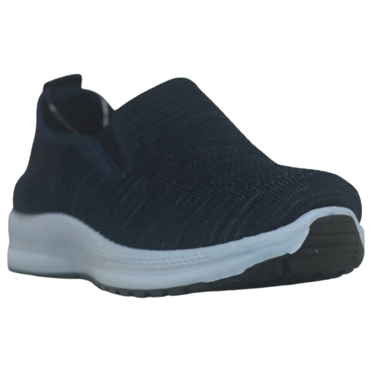 El tejido elástico abraza el pie como un segundo calcetín, proporcionando ajuste preciso sin necesidad de cordones. Al apoyar, la combinación de plataforma y cuña suaviza el impacto, mientras la suela de goma ofrece adherencia firme. El tono navy combina sobriedad y frescura, adaptándose a atuendos tanto deportivos como casuales.